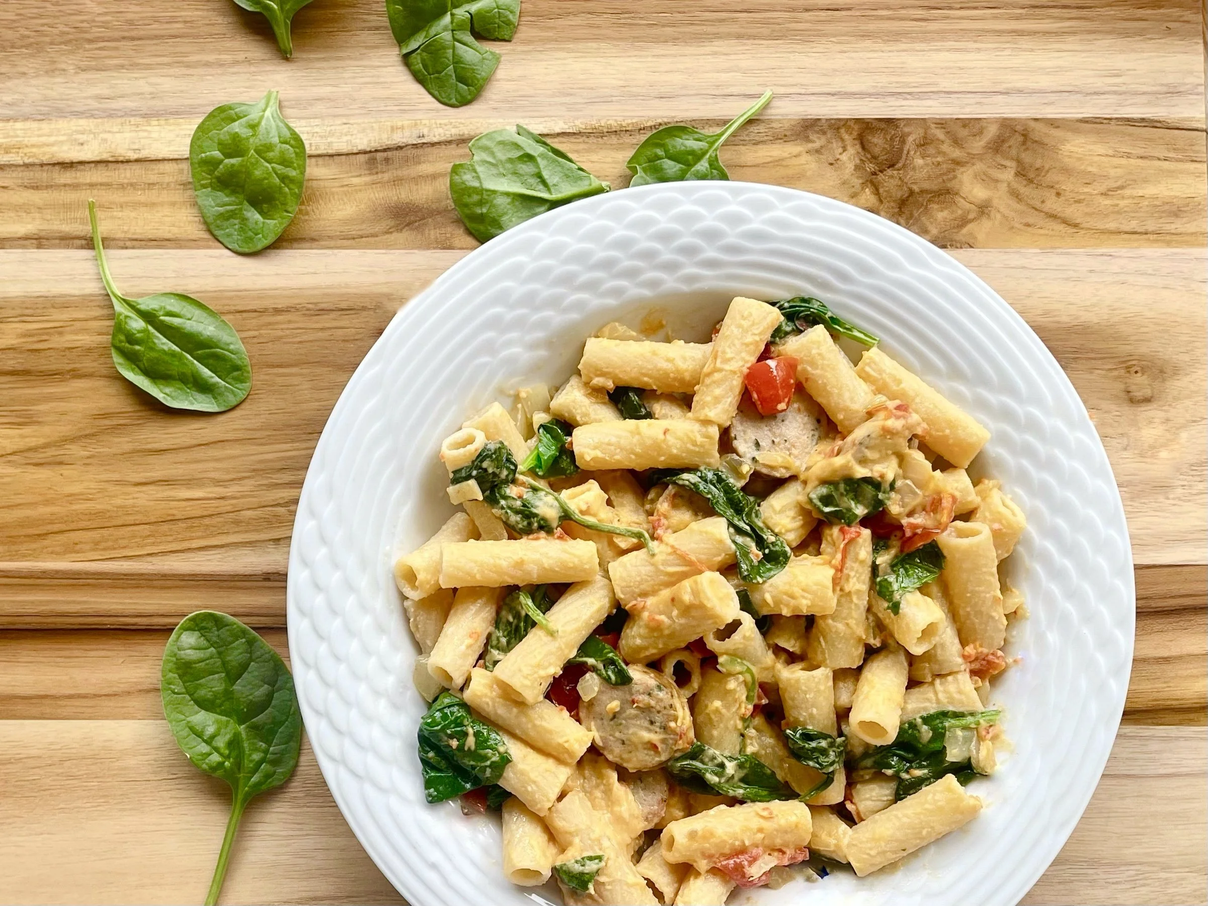 Once caramelized, add in sliced chicken sausage, diced tomato and spinach- sauté until spinach is cooked down.